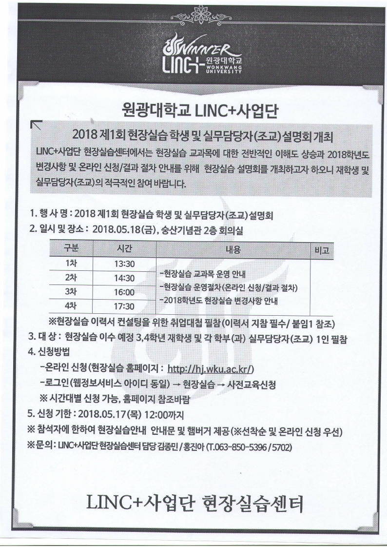 현장실습센터에서는 현장실습 교과목에 대한 전반적인 이해도 상승과 2018학년도 현장실습 변경사항 및 온라인 신청/결과 절차에 대한 설명회를 개최하오니 재학생들의 적극적인 참여 부탁드립니다. 가. 행사명 : 2018 제1회 현장실습 학생 및 실무담당자(조교) 설명회 나. 일 시 : 2018.05.18(금) / 13:30, 14:30, 16:00, 17:30 (시간대별 신청 가능) 다. 장 소 : 숭산기념관 2층 회의실 라. 참여대상 : 현장실습 이수 예정 3,4학년 재학생 마. 설명내용 1) 현장실습 교과목 운영 안내 바. 신청방법 및 기한 1) 신청방법 : 온라인 신청(현장실습센터 홈페이지 : http://hj.wku.ac.kr/) 사. 요청사항 1) 현장실습 이력서 컨설팅을 위해 이력서 지참 필수(현장실습 이력서 양식) |